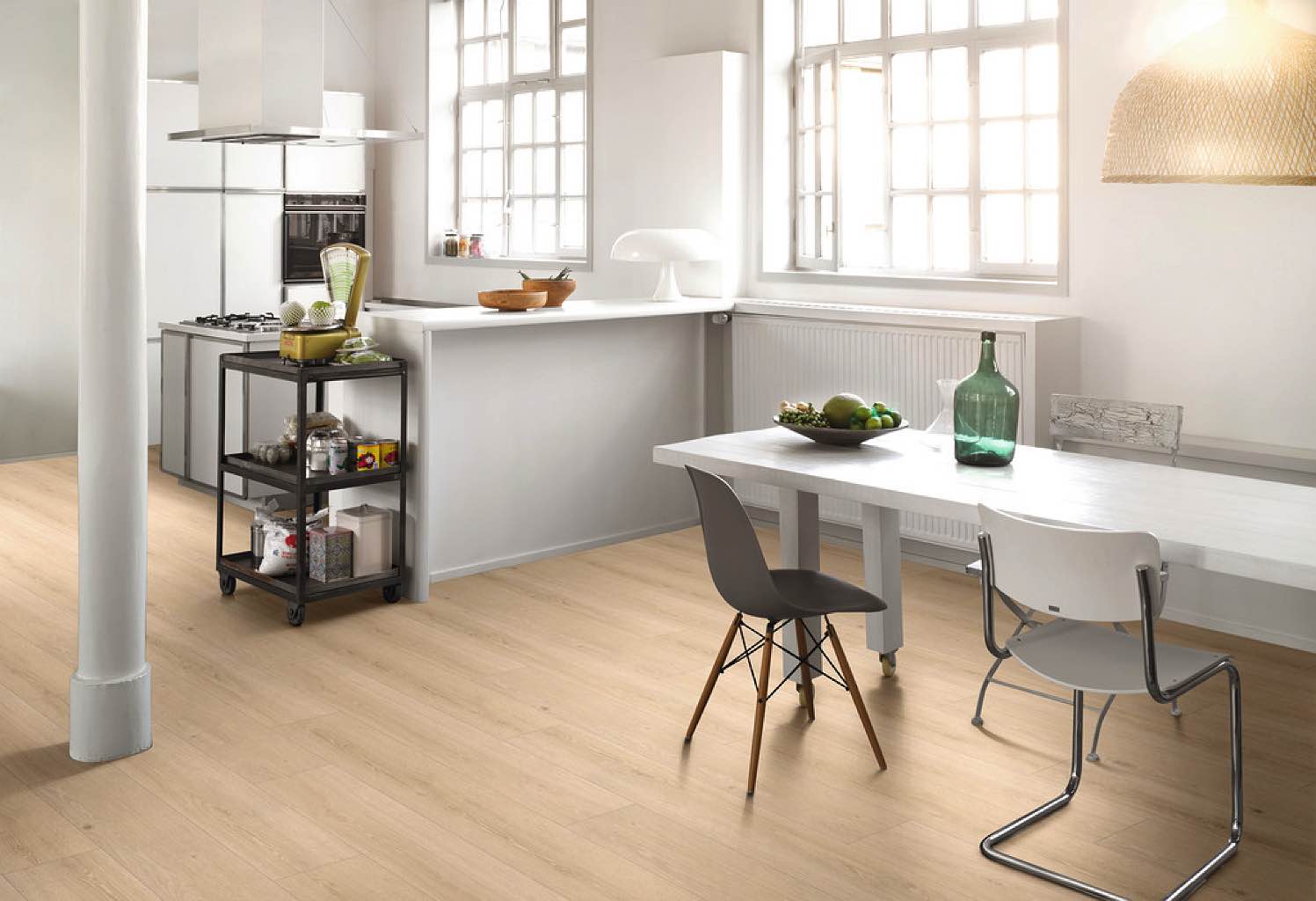 Die Trägerplatte mit erhöhtem Quellschutz bietet ein Schutz vor Feuchtigkeit und das Vollmaterial kann problemlos in Küche und Bad verlegt werden.